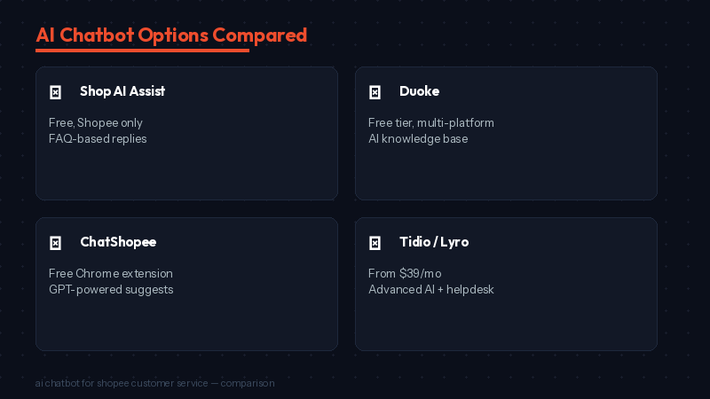 Quick Answer: The best AI chatbot for Shopee customer service depends on your store size. Solo sellers should start with Shopee’s free Shop AI Assistant. Multi-store sellers benefit most from Duoke’s unified inbox with AI auto-reply. For sellers who also need a helpdesk with ticket management, Tidio is the best entry-level option with its Lyro AI chatbot.
