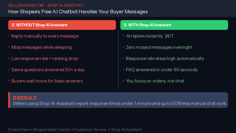 To enable it: go to Seller Centre → Customer Service → Shop AI Assistant, set up your custom FAQ for your most common questions, and toggle it on. Sellers in Malaysia report response times dropping to under one minute and workload reductions of up to 50% after enabling it.