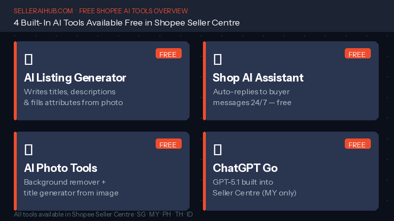 Yes. Shopee Seller Centre includes several free AI tools in 2026: the AI Listing Generator for titles and descriptions, the Shop AI Assistant chatbot for buyer messages, AI photo tools including a background remover and image-to-title generator, and ChatGPT Go for Malaysian sellers. These are available across Singapore, Malaysia, the Philippines, Indonesia, and Thailand.