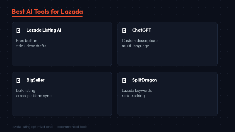 Yes. Lazada Seller Centre includes a Listing AI that generates title and description suggestions. It is free and built into the product listing page. For more powerful AI listing tools, use BigSeller or ChatGPT alongside Lazada’s built-in option.