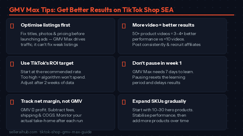 The good news for SEA sellers is that GMV Max’s automation genuinely works when set up correctly. The three inputs (products, ROI target, budget) are straightforward. The algorithm’s ability to combine paid ads with organic and affiliate content boost is a real advantage over running each format separately. And across SEA’s diverse markets, the per-country optimisation TikTok applies is more sophisticated than most sellers could configure manually.